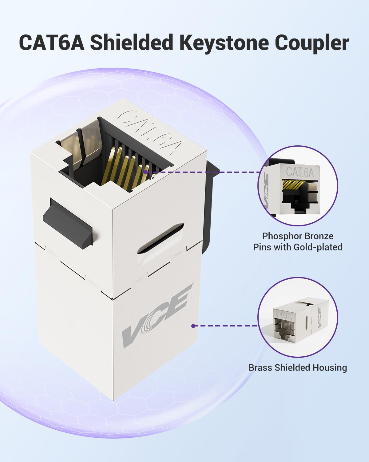 VCE Cat6A Shielded Keystone Coupler, 25 Pack STP Ethernet Coupler, POE Ready, High-Speed 10G, 500 MHz, Female to Female, for Patch Panel and Wall Plate