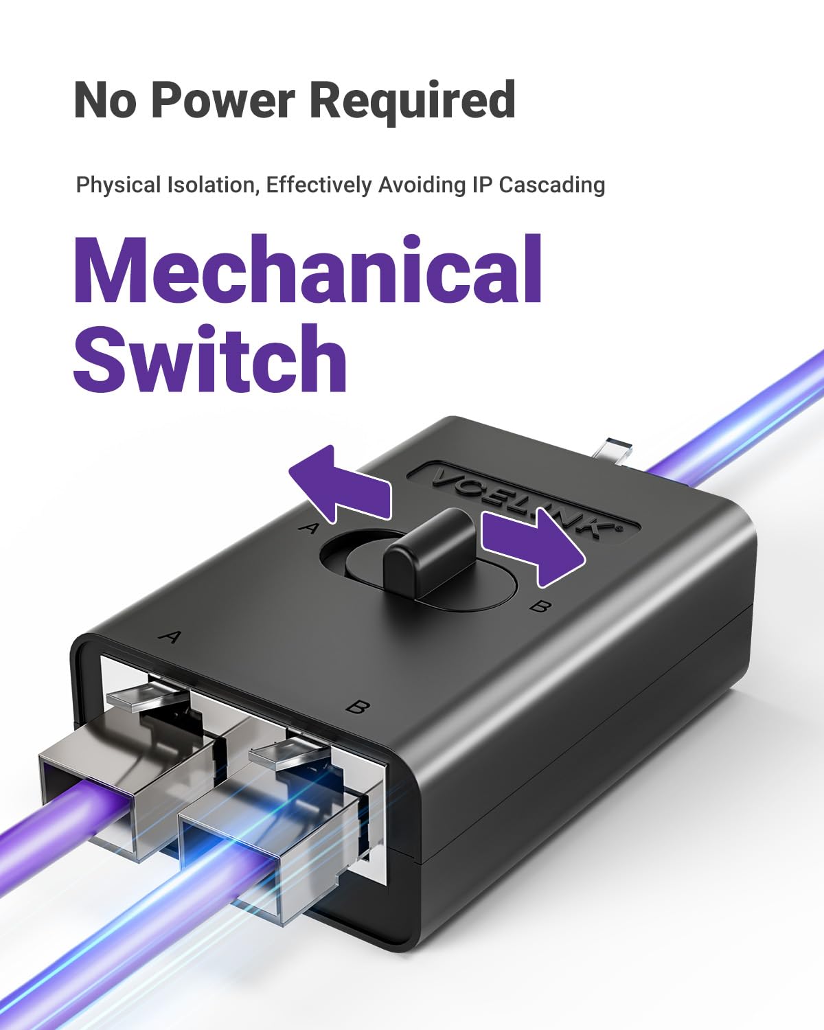 - Physical Isolation and Conversion: This ethernet switch 2 port features a 2-in-1-out configuration, which enables conversion by connecting two different networks to a single device and the option to select one of the networks for usage. With its purely mechanical switch operation, it is plug-and-play without the need for power. When one network is in use, the network switch provides physical isolation, effectively avoiding IP serial connection issues.