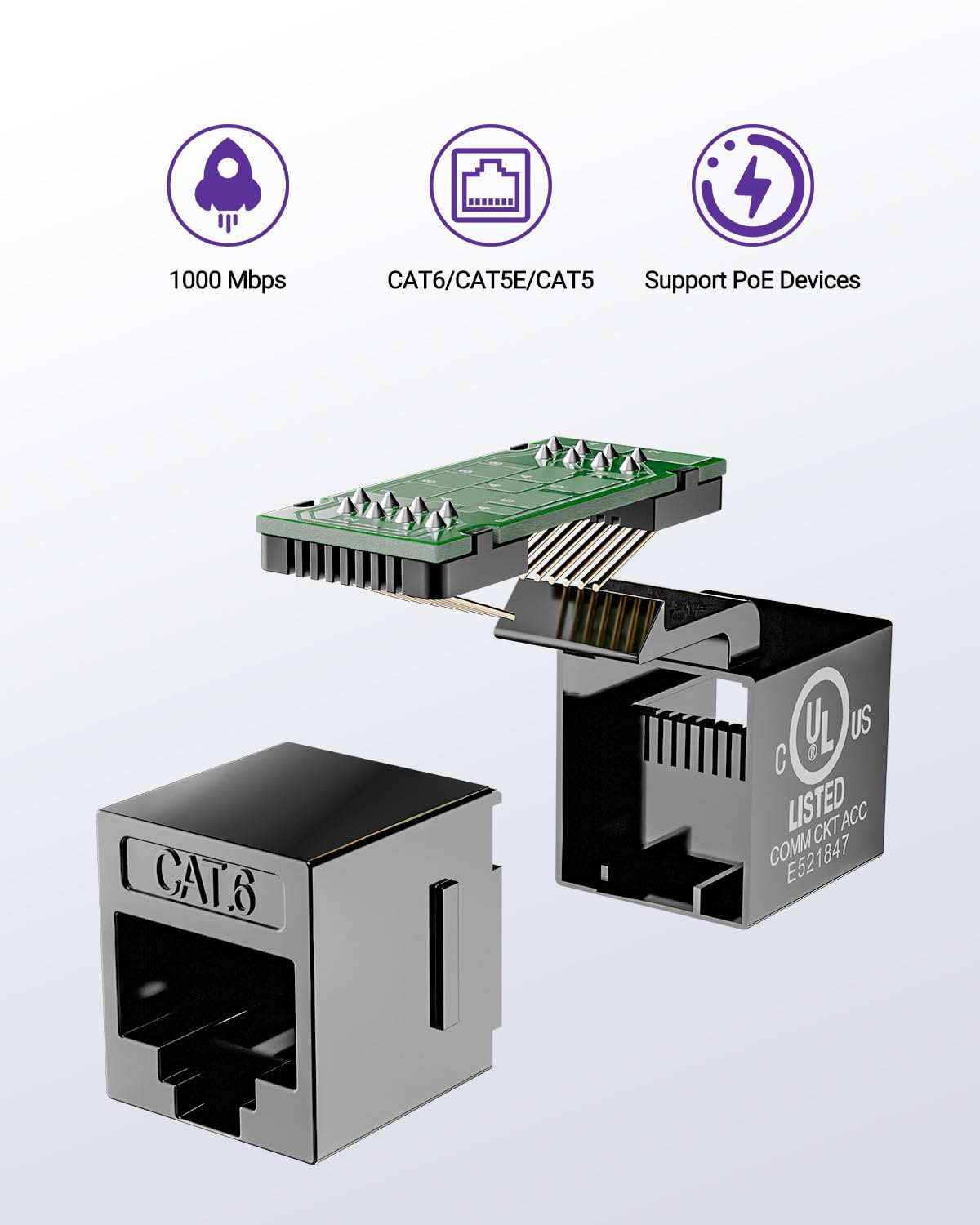 - HIGH SPEED ETHERNET COUPLER: Thanks to gold-plated contacts, the RJ45 coupler provides stable transmission up to 1 Gbps. Compatible with CAT6/CAT5E/CAT5 cables and supports PoE applications, making it well-suited for both home and outdoor use